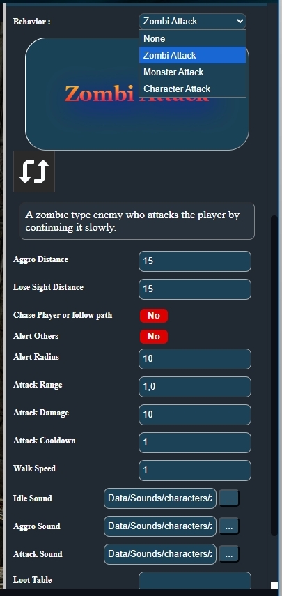 📄 View manual in PDF format Listen in voice mode : ![]() ActorsLast update : January 04, 2026🔗 BehaviorYour actors need default behaviors, except in the case of the player (the character you directly control).Actor behaviors define how they will behave in the game, most often how they will interact with or attack the player. These are simple, predefined scripts that can be configured directly in the editor. Below is an example using the "ZombieAttack" behavior.