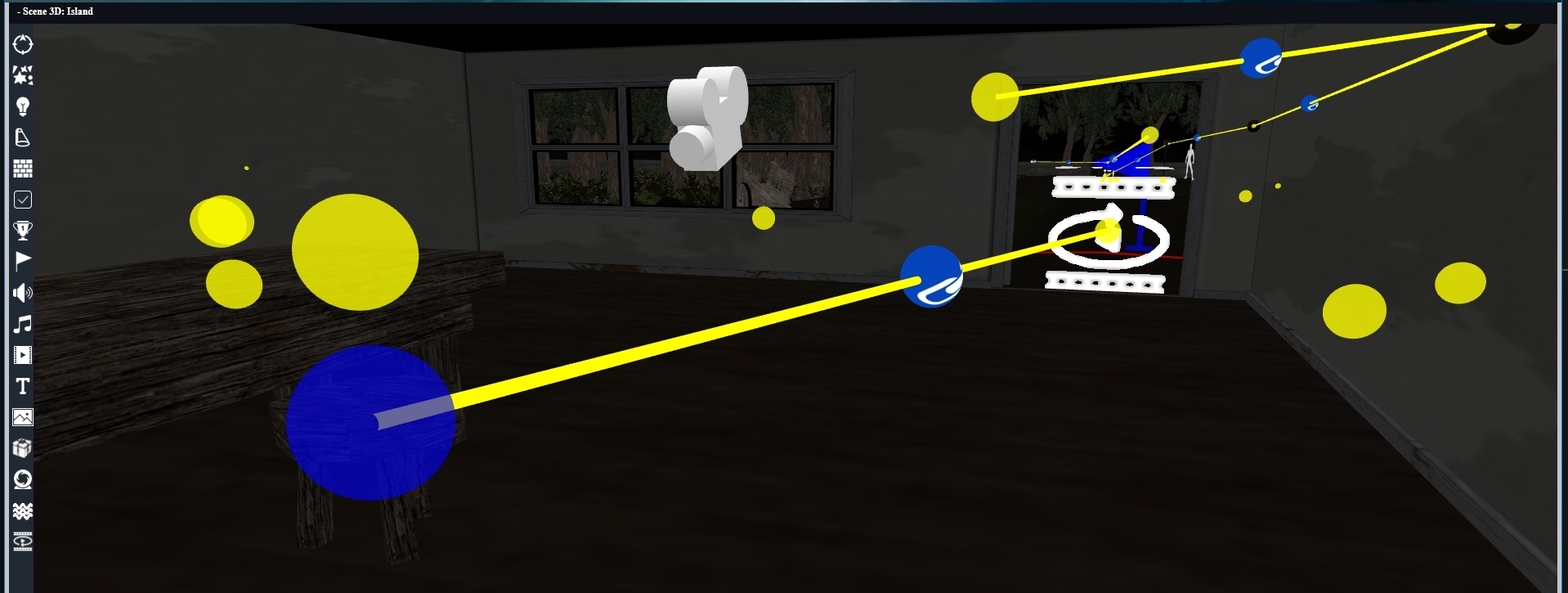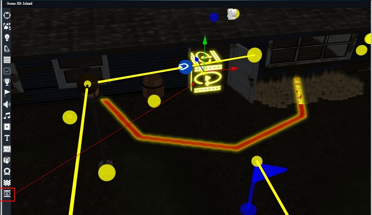 This object is the one that will store all the cinematic data when it is saved. These data are later retrieved by the game at runtime. But this 3D object does more than just unlock the button. A cinematic needs to be triggered by an event in the game. In the editor, a specific GameElement is used for this purpose. The object that contains the cinematic must therefore be connected to a GameElement that will trigger it. π Like other objects, the cinematic object has a connection point. However, this one is blue instead of yellow, making it easier to identify objects that contain cinematics. To see these connection points, the βVisual Logicβ mode must be enabled. Letβs look at this step by step with images. First, the GameElement used as a trigger: