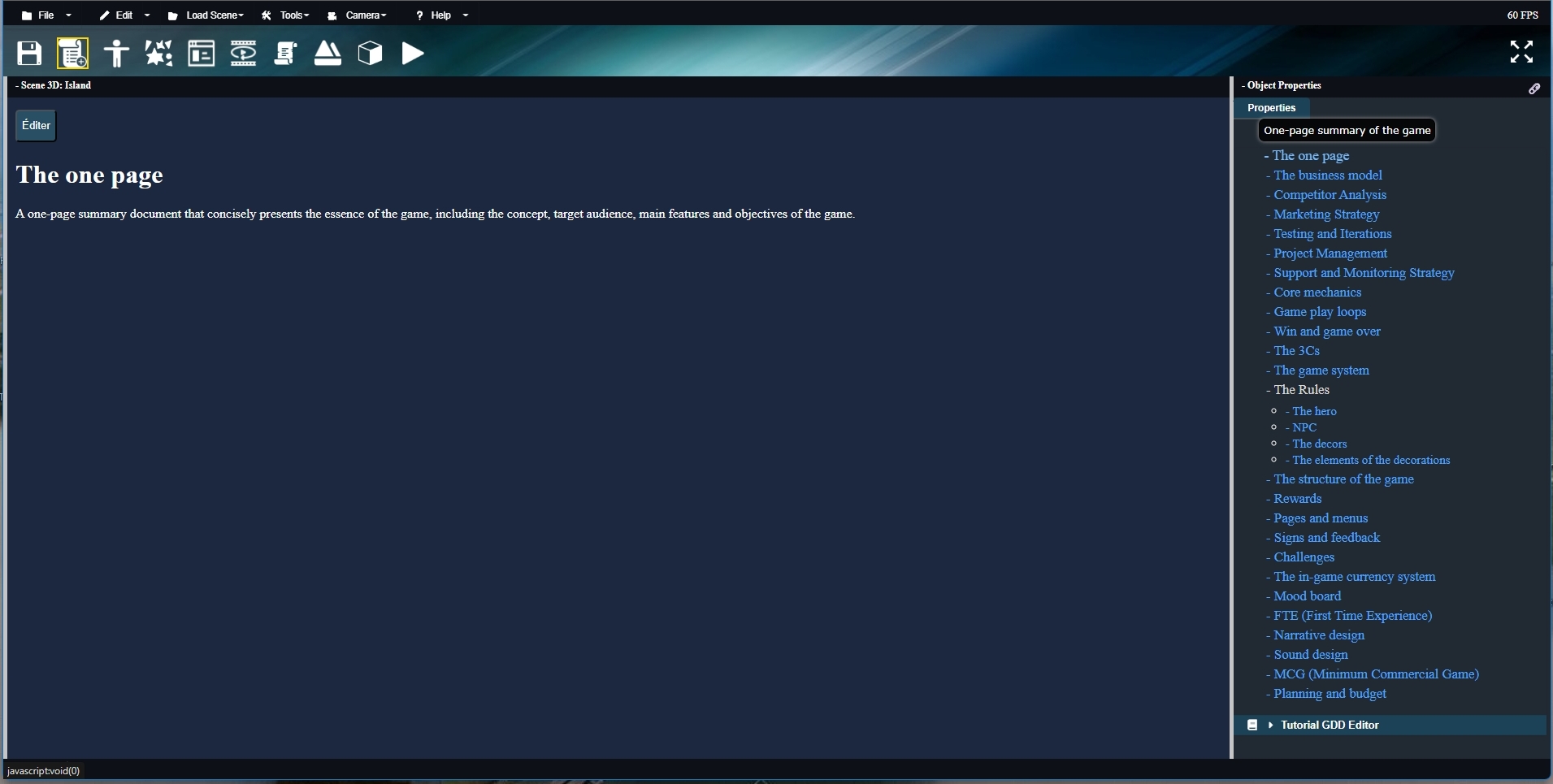 π View manual in PDF format Listen in voice mode : ![]() GDDLast update : January 06, 2026π PresentationHere is an editor that may seem a bit intimidating at first. What is a GDD?It stands for Game Design Document. In other words, it is a project specification document. But what is it used for? π€ It is a reference document that, during the game design phase, describes in detail all the elements that should be part of the game: Gameplay (actions), universe, rules, audio and visual effects, 3D models, graphic style, storyboard, and more. Once completed, this GDD becomes your main reference to build your game, knowing exactly where you are going, why, and how. π§ This editor already does a large part of the work for you by providing a side panel with many ready-to-use sections, covering all the aspects a proper GDD should contain. If you do not neglect it, it will become an extremely valuable tool. Gather all your ideas here and improve them progressively as your project evolves. βοΈ With this editor β which is almost never available in traditional game editors β you will be able to create coherent and ambitious games, while saving a considerable amount of time. π Letβs take a look at what this editor looks like: