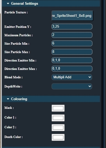 This panel is designed to let you edit the main properties in a logical sequence. * The first thing to do is to select the particle texture. Clicking the button opens the library containing all available particle images, allowing you to quickly find the one that fits your needs. 🖼️ * Next, adjust the Y position of the particle emission. Should the particles be emitted from the ground, or higher up in the air? 🌫️ * Then, define the maximum number of particles you want to emit. This can be 100, 500, 1000, and so on. Be careful with high values: this is where you need to find a balance between visual quality and performance. ⚖️ * After that, set the minimum and maximum size of the particles. Each particle will have a random size between these two values. * Next comes the minimum and maximum direction, defined on the X, Y, and Z axes (X = left / right, Y = up / down, Z = forward / backward). Use values like -1 or 1 to define directions: -1 represents left, down, or backward depending on the axis. 🧭 * Then, choose the Blend Mode, which defines how particles are blended together: - ONEONE: Colors are added together without alpha transparency affecting the result (default). - STANDARD: Colors are blended using the particle alpha. - ADD: Colors are added, but only the particle color uses alpha. - MULTIPLY: Colors are multiplied and combined. - MULTIPLYADD: Two render passes using MULTIPLY and ADD. * Finally, Depth Write (yes or no) determines whether particles write depth information to the depth buffer. This can help prevent other draw calls from rendering over the particles. 🧱 This panel is also linked to the "Colouring" panel, which allows you to modify particle colors: Mask: Applies a mask to the texture to filter certain colors or parts of the alpha channel. Color 1: The base color of the particle during its lifetime. Color 2: A secondary color that is blended or mixed with Color 1 over the particle’s lifetime. Death Color: The color the particle will have at the very end of its life. 💀 At this stage, you now have the foundation of a particle system. This is the base setup. However, you can go further to create more complex effects. ✨ This is what we will explore in the next chapter: Velocity. |