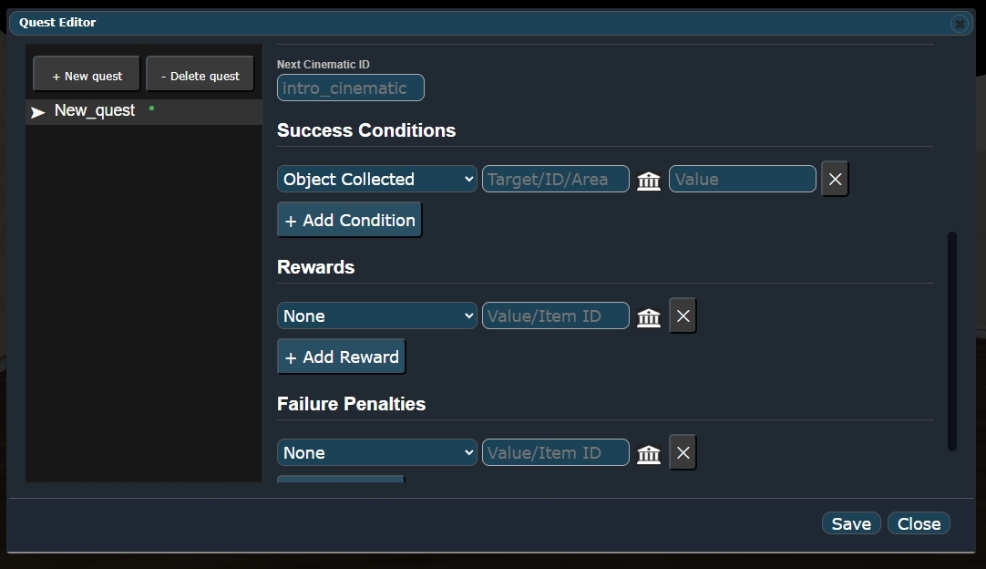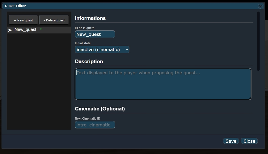 📄 View manual in PDF format Listen in voice mode : ![]() QuestsLast update : January 07, 2026🔗 PresentationThe Quest Editor allows you to trigger missions or quests that are linked to cinematics or GUI windows. 🎬🖥️For example, a cinematic can be played and, once it ends, a mission is automatically triggered. This is a common approach used in many AAA games. Another example: an NPC interaction opens a GUI window and assigns a quest to the player. This type of workflow is typically found in MMORPGs. 🧙♂️📜 The Quest / Mission Editor is mainly used to create quest references. These references allow you to define rewards in case of success, penalties in case of failure, and—most importantly—the conditions required to complete a quest. ✅❌ This editor can be used from any other editor. It does not open as a standalone tool, but instead appears as a separate window on top of the current editor. This makes it especially useful when working in the Level Editor or the Cinematic Editor and you need to assign or reference a quest quickly. 🧩 Let’s take a look at what the Quest / Mission Editor looks like: